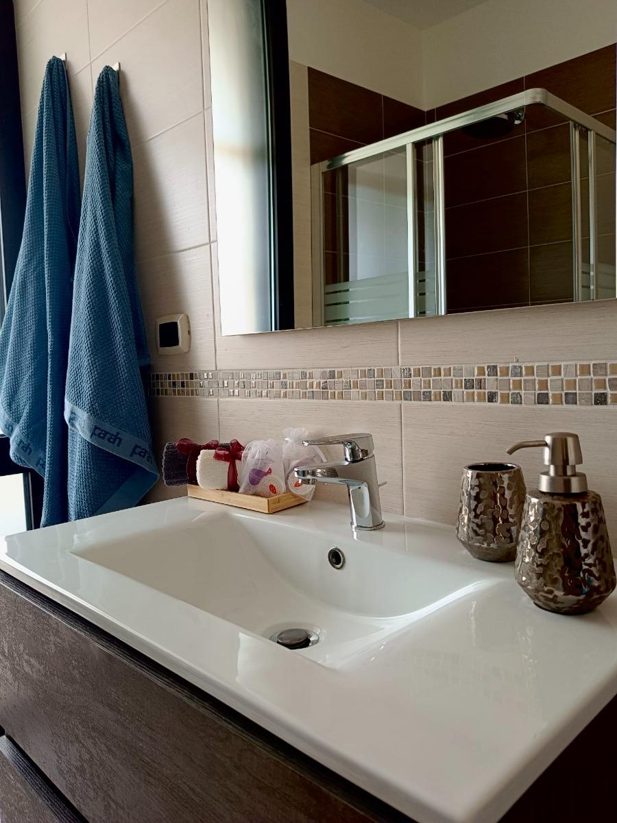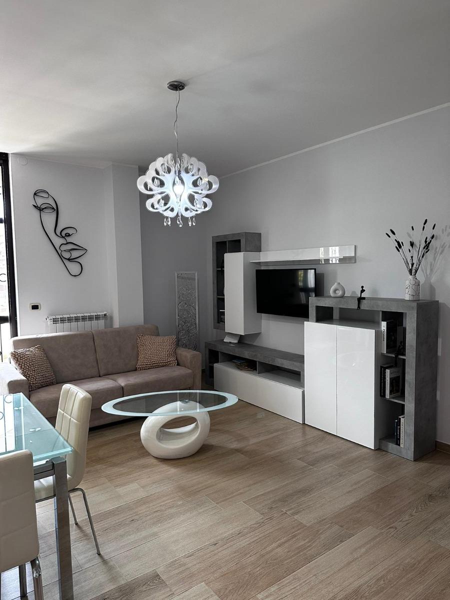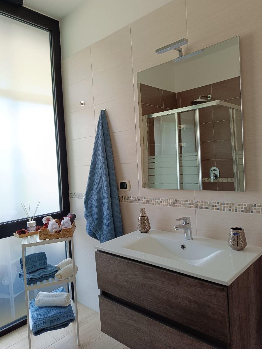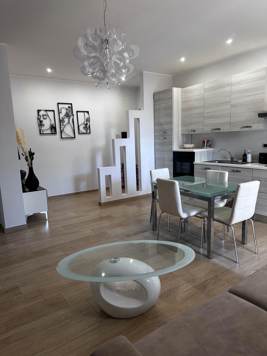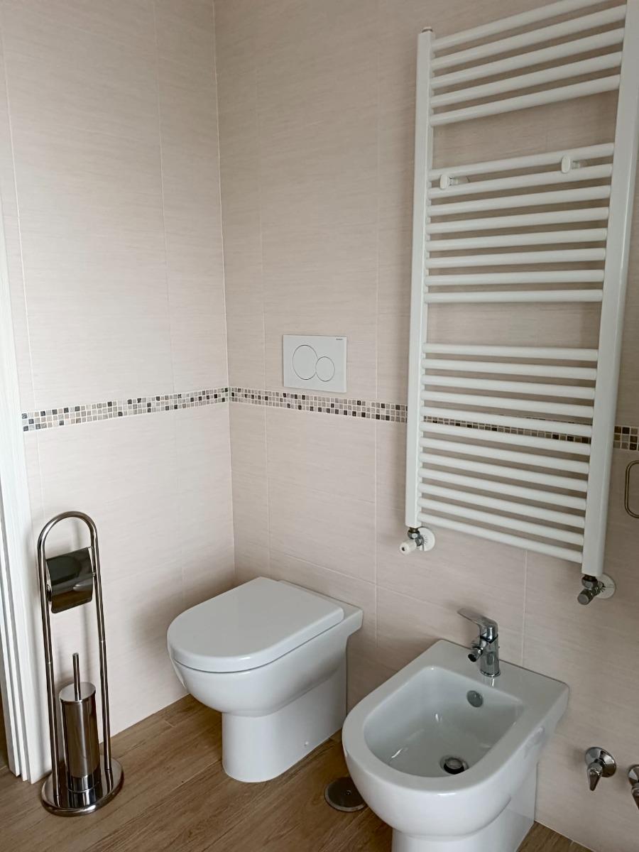 All'interno, l'appartamento accoglie gli ospiti con un ampio ingresso che conduce a un luminoso salone, perfetto per momenti di relax. La cucina è completamente attrezzata, con lavastoviglie, forno, frigorifero, piano cottura e un angolo colazione, per chi ama preparare i propri pasti. Le due camere matrimoniali offrono un comfort eccezionale, mentre un divano letto in salotto offre ulteriore spazio per gli ospiti. L'appartamento dispone di due bagni moderni, garantendo comodità e privacy.